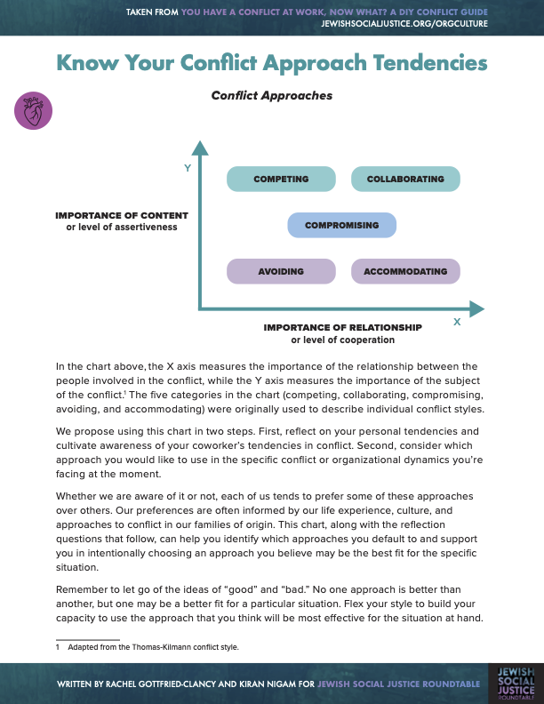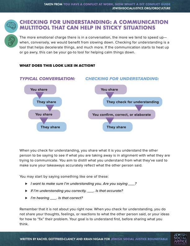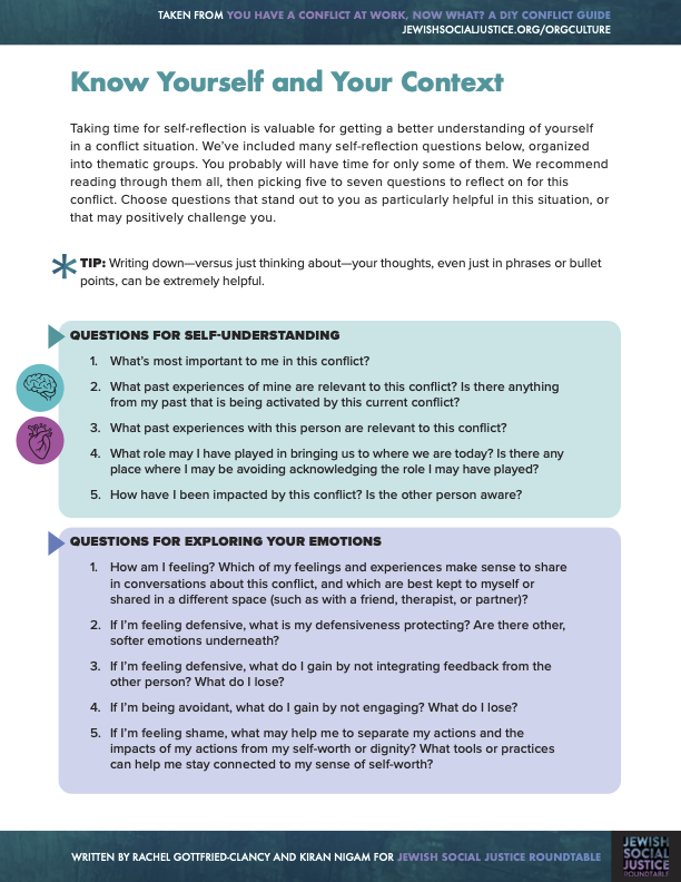 This new DIY guide, designed by the Jewish Social Justice Roundtable, supports staff members to find more ease with colleagues and organizations to become better places to work by offering tools to navigate through workplace conflict in productive, generative ways. Starting with foundational steps that many people skip, like identifying if there is a conflict and if it should be addressed, the guide moves to exercises and tips for effectively moving through challenging conversations. It includes skills for participants in different roles within the conversation and also addresses power and other dynamics that impact conflict in the workplace.